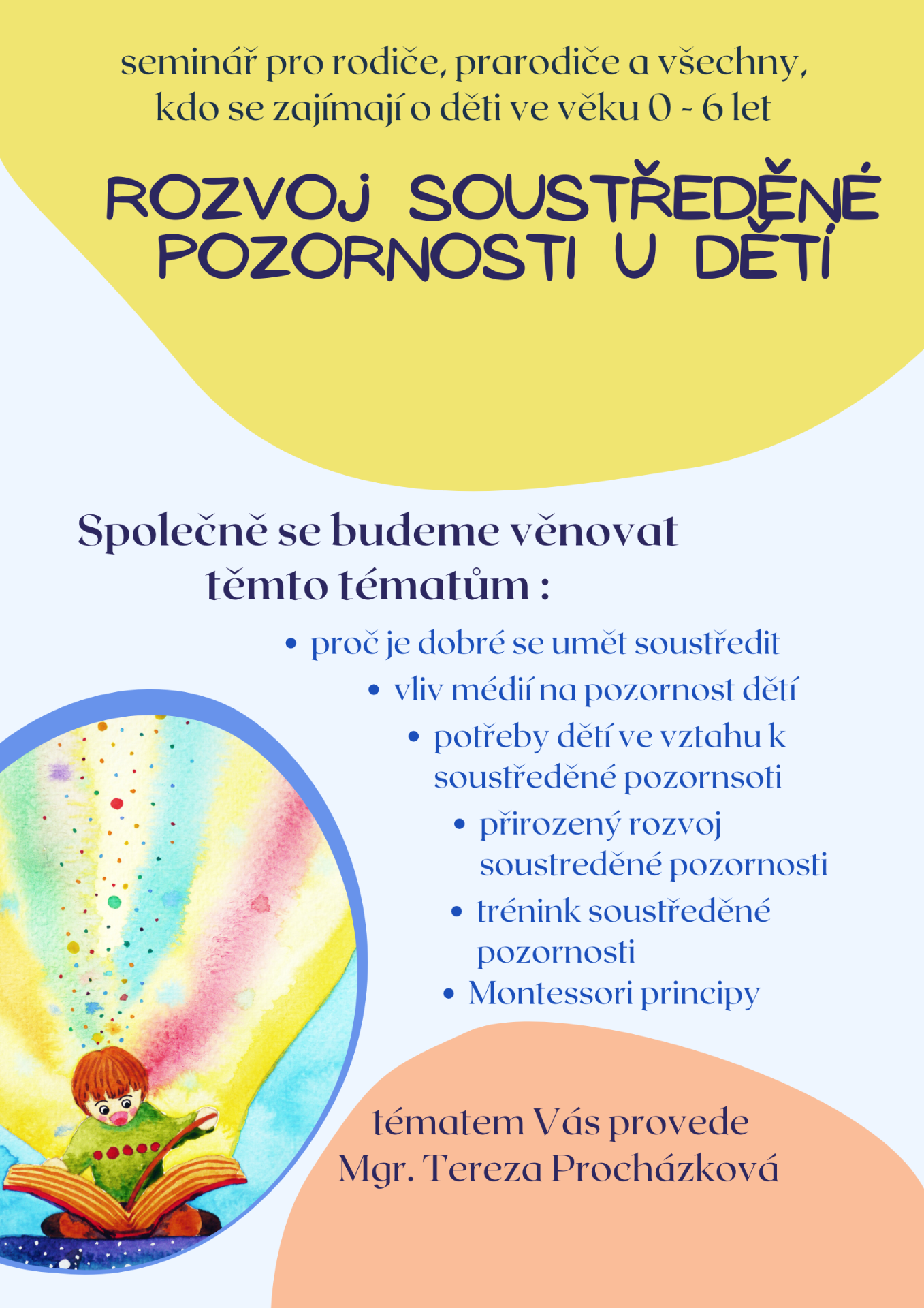 V rámci 4hodinového semináře se zaměříme na to, proč je pro člověka dobré naučit se soutředěné pozornosti, jaká mají na rozvoj této oblasti vliv média, jak lze záměrnou pozornost přirozeně podporovat a jak ji cíleně trénovat. Blíž se podíváme na některé principy Montessori pedagogiky, které s tématem souvisí. Seminář jsem sestavila zejména pro ty, kdo plánují/očekávají dítě, nebo už děti ve věku 0–6 let mají. Zúčastnit se rozhodně může každý, kdo s dětmi pracuje nebo má zájem se o této zásadní problematice dozvědět víc.